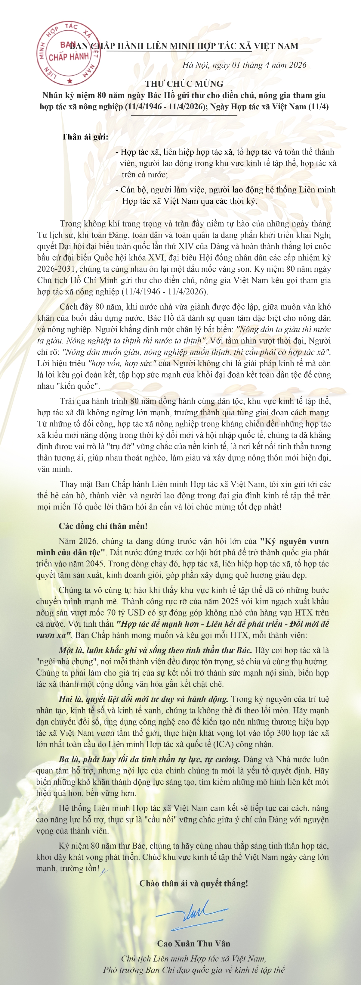 Nhân kỷ niệm 80 năm ngày Bác Hồ gửi thư cho điền chủ, nông gia tham gia hợp tác xã nông nghiệp (11/4/1946 - 11/4/2026); Ngày Hợp tác xã Việt Nam (11/4), VnBusiness (Tạp chí Kinh Doanh) trân trọng giới thiệu thư chúc mừng của bà Cao Xuân Thu Vân, Chủ tịch Liên minh Hợp tác xã Việt Nam, Phó trưởng Ban Chỉ đạo quốc gia về kinh tế tập thể.