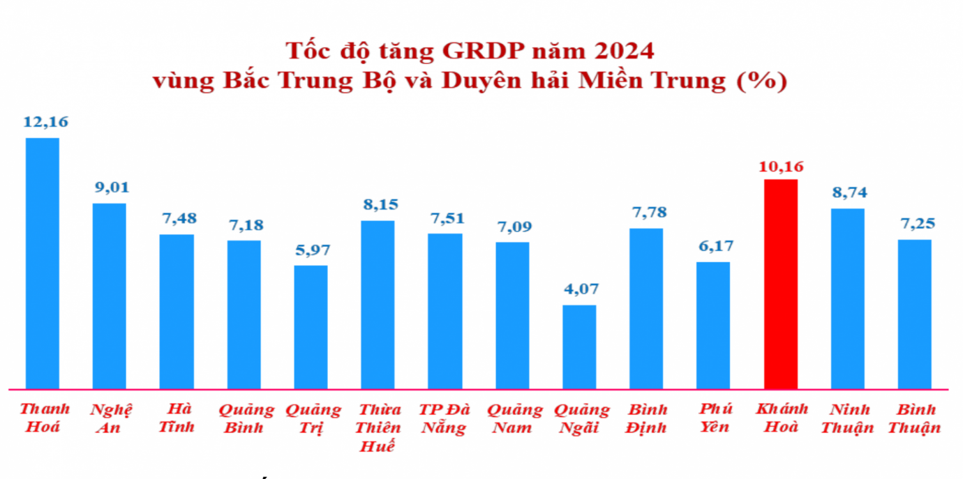 Báo cáo thống kê Tình hình kinh tế - xã hội tỉnh Khánh Hòa năm 2024 cho biết, tổng sản phẩm trên địa bàn tỉnh (theo giá so sánh 2010) năm 2024 ước đạt hơn 64.875 tỷ đồng, tăng 10,16% so năm 2023. Với kết quả này, Khánh Hòa là tỉnh có tốc độ tăng GRDP xếp vị thứ 7/63 tỉnh, thành của cả nước và đứng thứ 2 của vùng Bắc Trung Bộ và Duyên hải miền Trung.