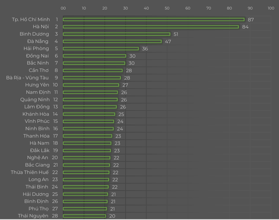 Báo cáo này chỉ ra, TP. Hồ Chí Minh tiếp tục dẫn đầu về xếp hạng Chỉ số Thương mại điện tử Việt Nam năm 2024 với 87 điểm. Đứng thứ hai là Hà Nội với 84,3 điểm. Đứng thứ ba trong bảng xếp hạng là Bình Dương với 51,3 điểm và cũng có khoảng cách rất xa so với Hà Nội lên tới 33 điểm.